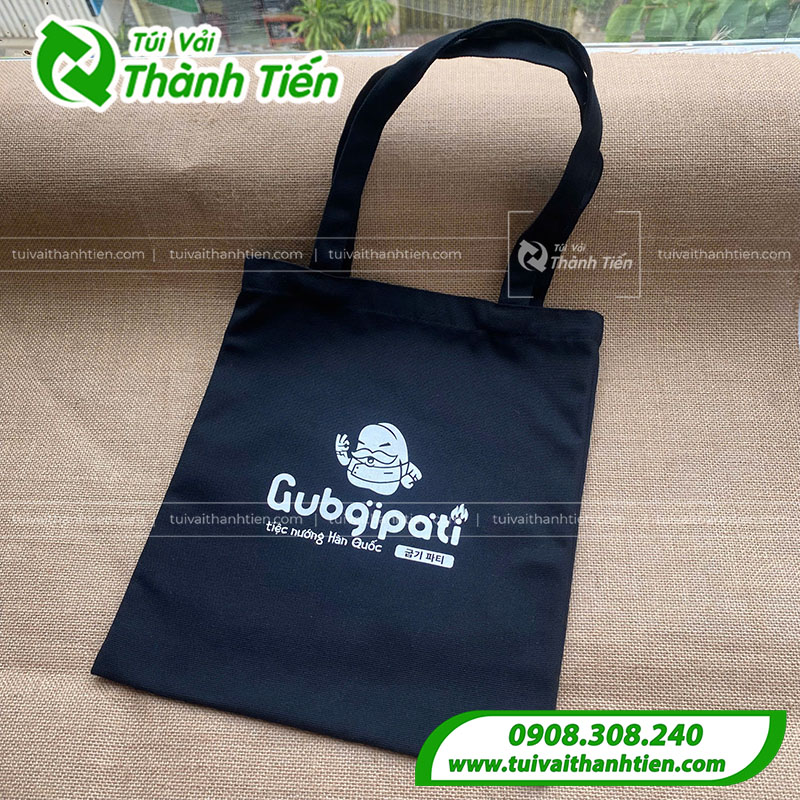 Túi vải canvas đen in logo thương hiệu là món quà tặng ý nghĩa cho khách hàng, đối tác hoặc nhân viên. Thành Tiến cung cấp dịch vụ in ấn theo yêu cầu, đảm bảo sản phẩm chất lượng và mang dấu ấn riêng.