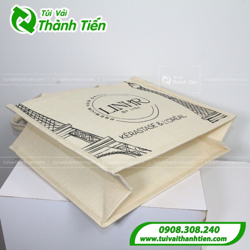 Túi vải linen thiết kế hình hộp chắc chắn, in logo LINH BY LISA nổi bật cùng họa tiết tháp Eiffel sang trọng. Chất liệu linen bền đẹp, thân thiện với môi trường, phù hợp làm túi đựng quà tặng, mỹ phẩm hoặc sản phẩm chăm sóc tóc cho salon, spa và sự kiện làm đẹp. Giải pháp túi vải quà tặng chuyên nghiệp, nâng tầm thương hiệu.