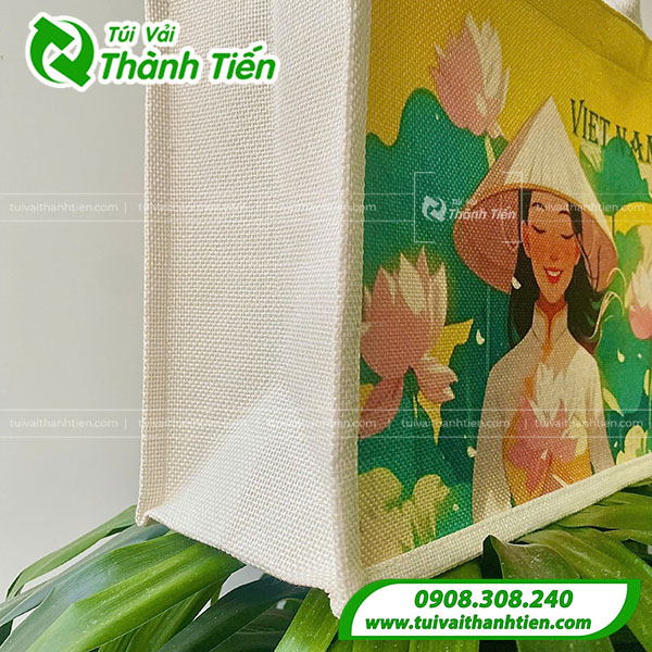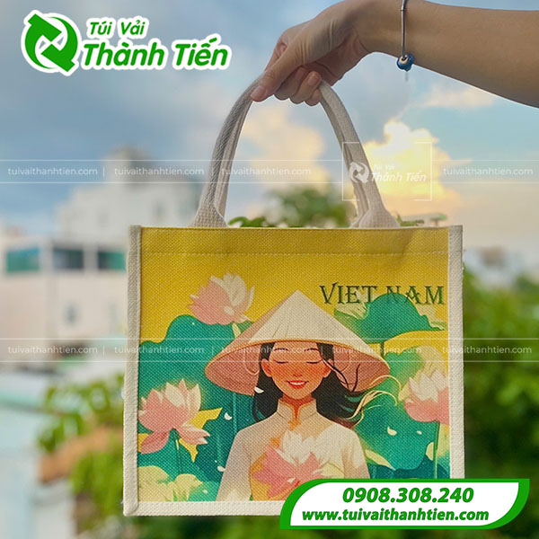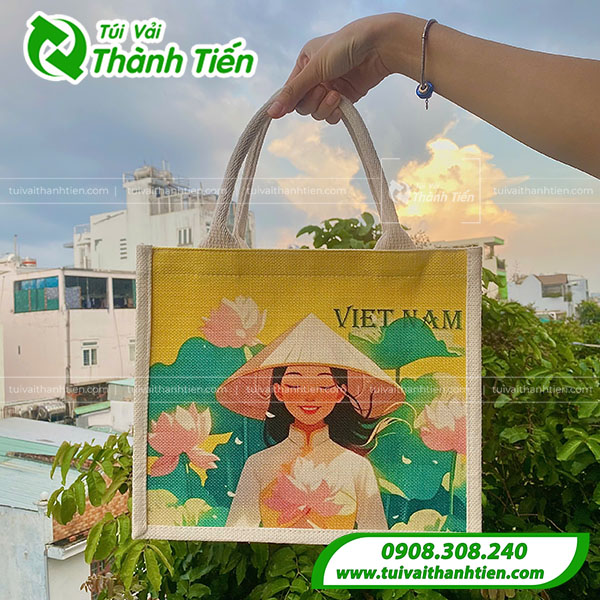 Những mẫu túi đay in ấn theo yêu cầu với màu sắc đa dạng, đặc sắc giúp làm nổi bật khi mang theo. Tham khảo thông tin sản phẩm túi vải đay in hình cô gái Việt Nam tại xưởng Túi Vải Thành Tiến