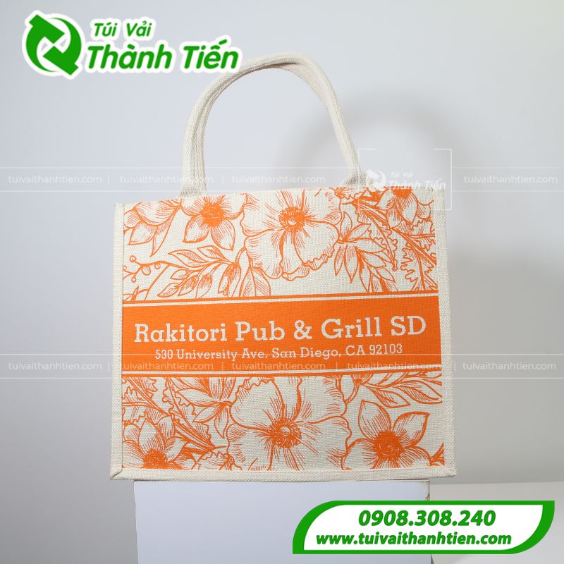 Túi vải linen cao cấp với thiết kế hoa văn vintage in sắc nét, nổi bật cùng logo thương hiệu Rakitori Pub & Grill SD. Chất liệu linen thân thiện môi trường, bền đẹp và sang trọng, thích hợp dùng làm túi đựng sản phẩm, quà tặng doanh nghiệp hoặc túi thời trang cho nhà hàng – quán ăn. Sự kết hợp giữa thẩm mỹ và tiện dụng, giúp nâng tầm hình ảnh thương hiệu. Dưới đây, là một số thông tin về sản phẩm tại Túi Vải Thành Tiến: