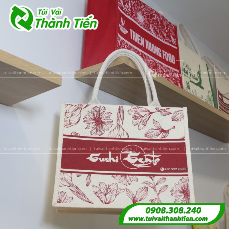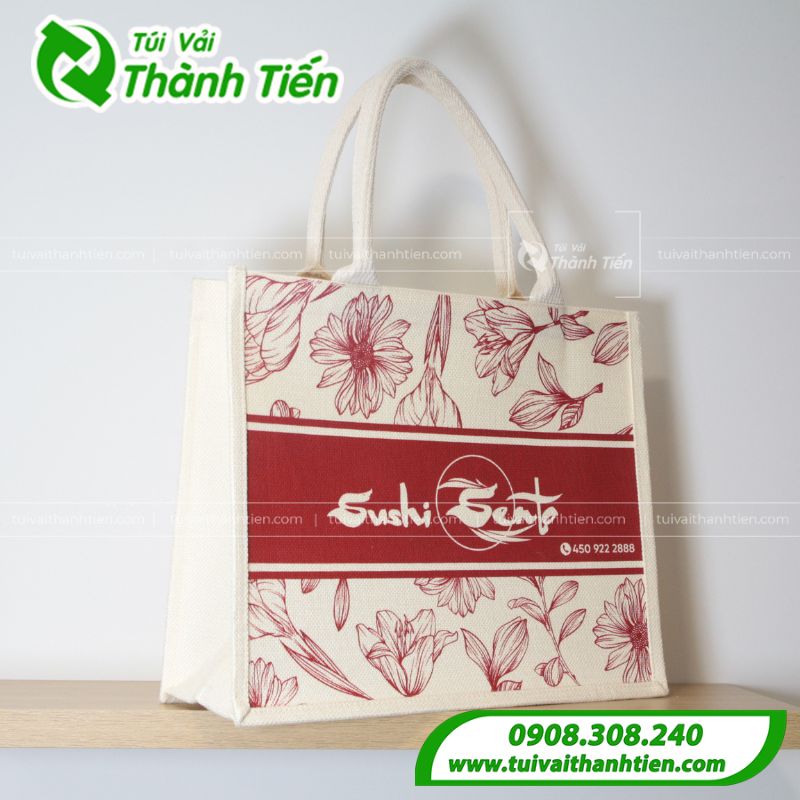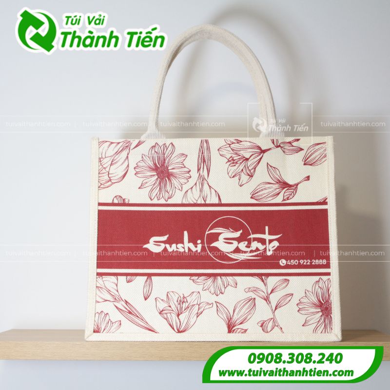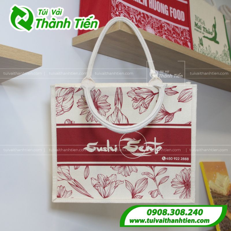 Mẫu túi vải linen Sushi Sento nổi bật với họa tiết hoa đỏ được in tinh tế trên nền vải màu kem tự nhiên, tạo cảm giác nhẹ nhàng, thanh lịch và mang đậm phong cách thủ công. Thiết kế điểm nhấn là dải màu đỏ rượu vang in logo thương hiệu “Sushi Sento” sắc nét, giúp tăng độ nhận diện và thể hiện cá tính thương hiệu rõ ràng. Quai túi chắc chắn, chất liệu linen dày dặn, thân thiện với môi trường – rất phù hợp dùng làm túi đựng quà tặng, túi mua sắm cao cấp hoặc túi đồng hành cho các sự kiện doanh nghiệp.