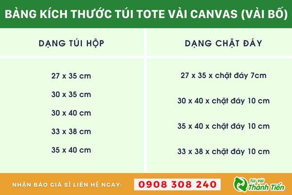 Bảng kích thước túi tote vải canvas (vải bố) tại Túi Vải Thành Tiến